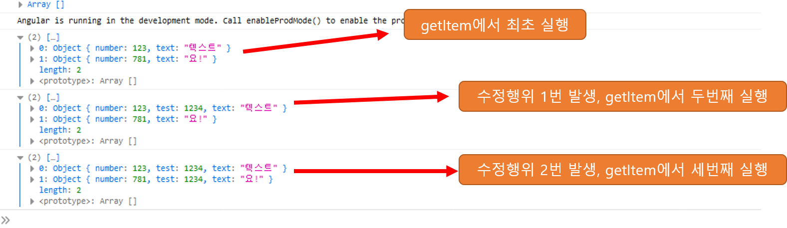 마찬가지로 수정행위를 한 것 뿐인데 getItem에서 콘솔이 자동으로 실행이 되었다.
