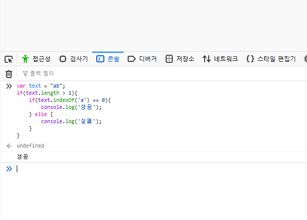 "변수 text에 ab라는 값을 대입합니다. 조건문을 활용하여 ab의 길이가 1보다크고, ab값의 0번째 텍스트가 a면 성공을, b면 실패를 출력하여주세요."