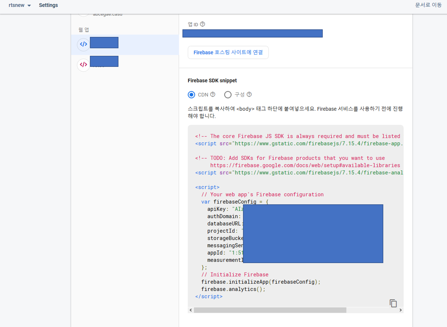 여기서 setDatabaseUrl메소드에 사용된 데이터베이스 주소는 파이어베이스 웹 콘솔에서 프로젝트 설정에서 가장 맨처음 나오는 화면의 내 앱을 클릭하면 볼 수 있습니다.