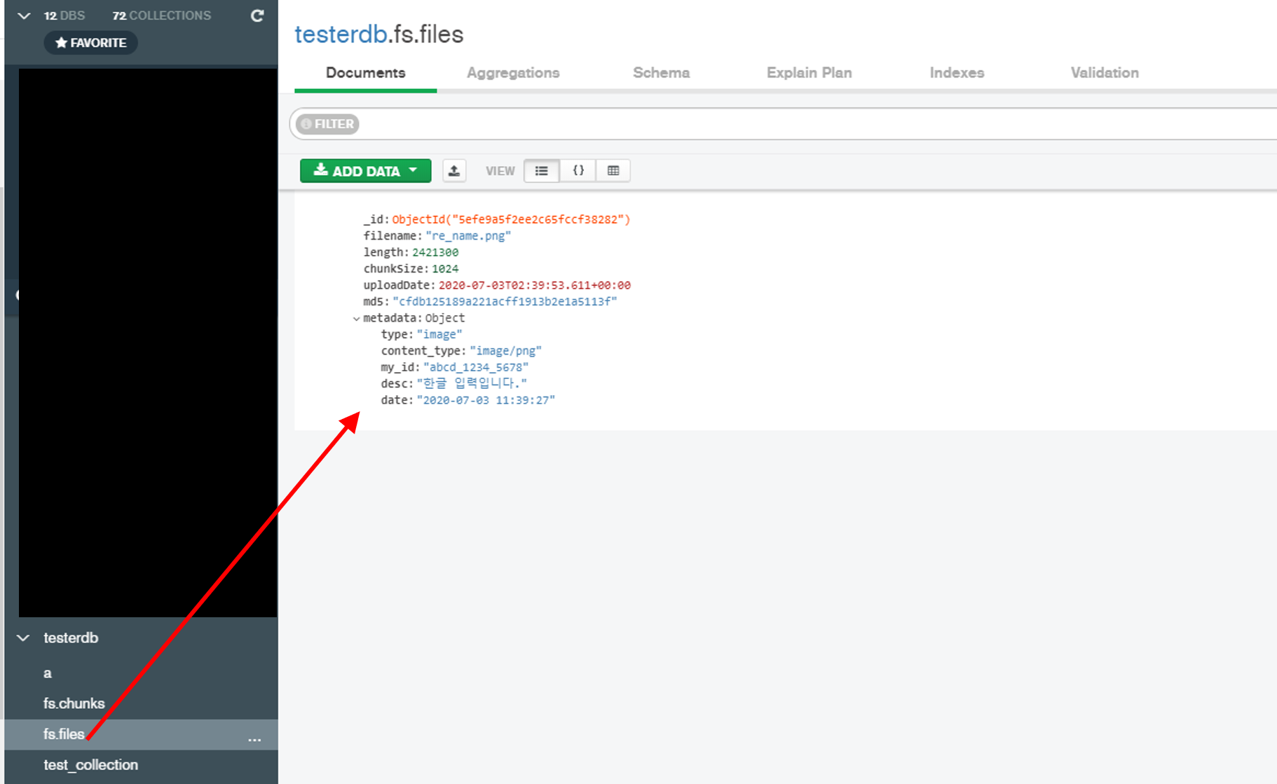 입력한 데이터인 metadata에 접근하여 조회를 하는 모습입니다.