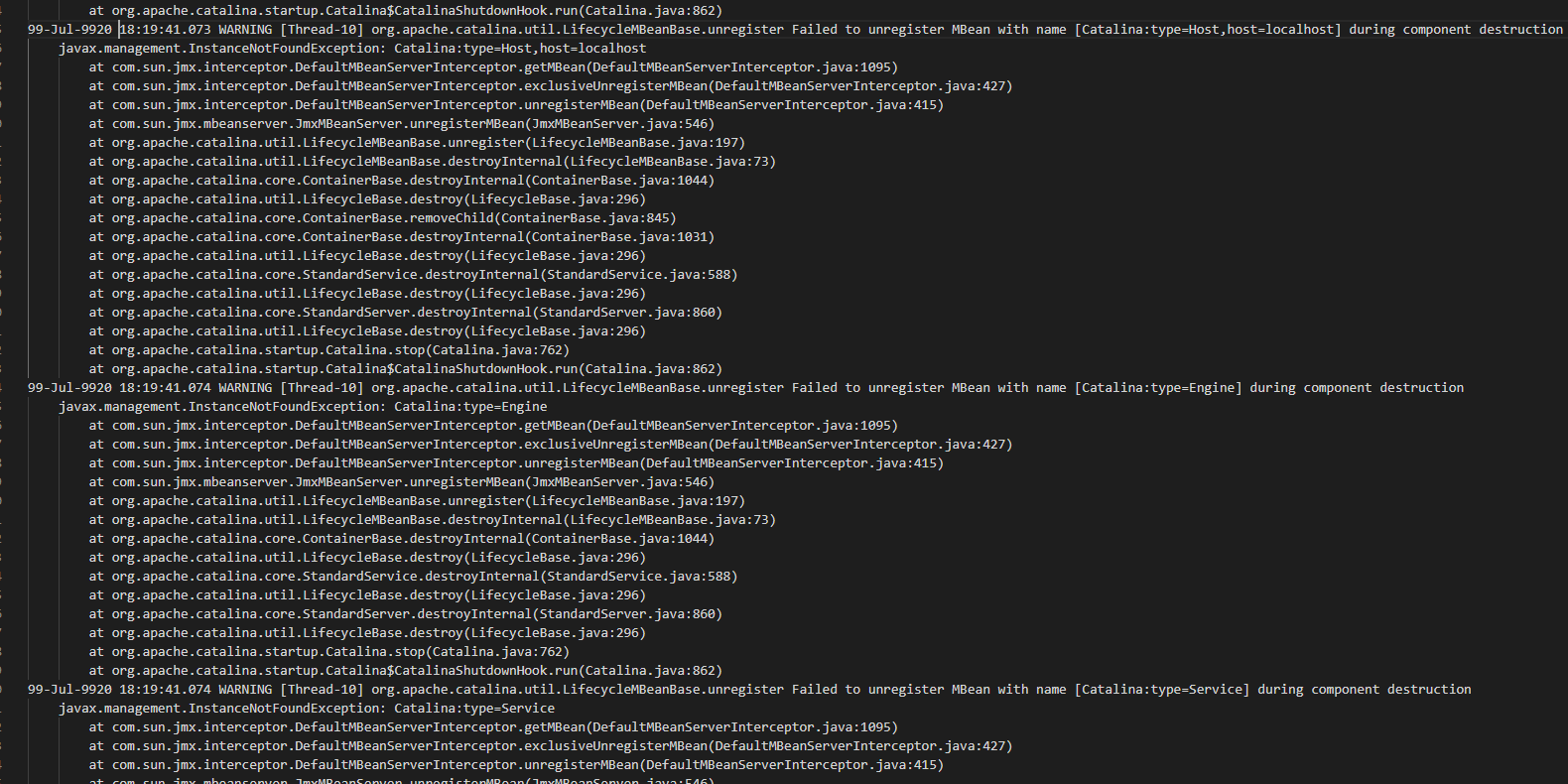 org.apache.catalina.util.LifecycleMBeanBase.unregister Failed to unregister MBean with name [Catalina:type=여러형태의 값] during component destruction
