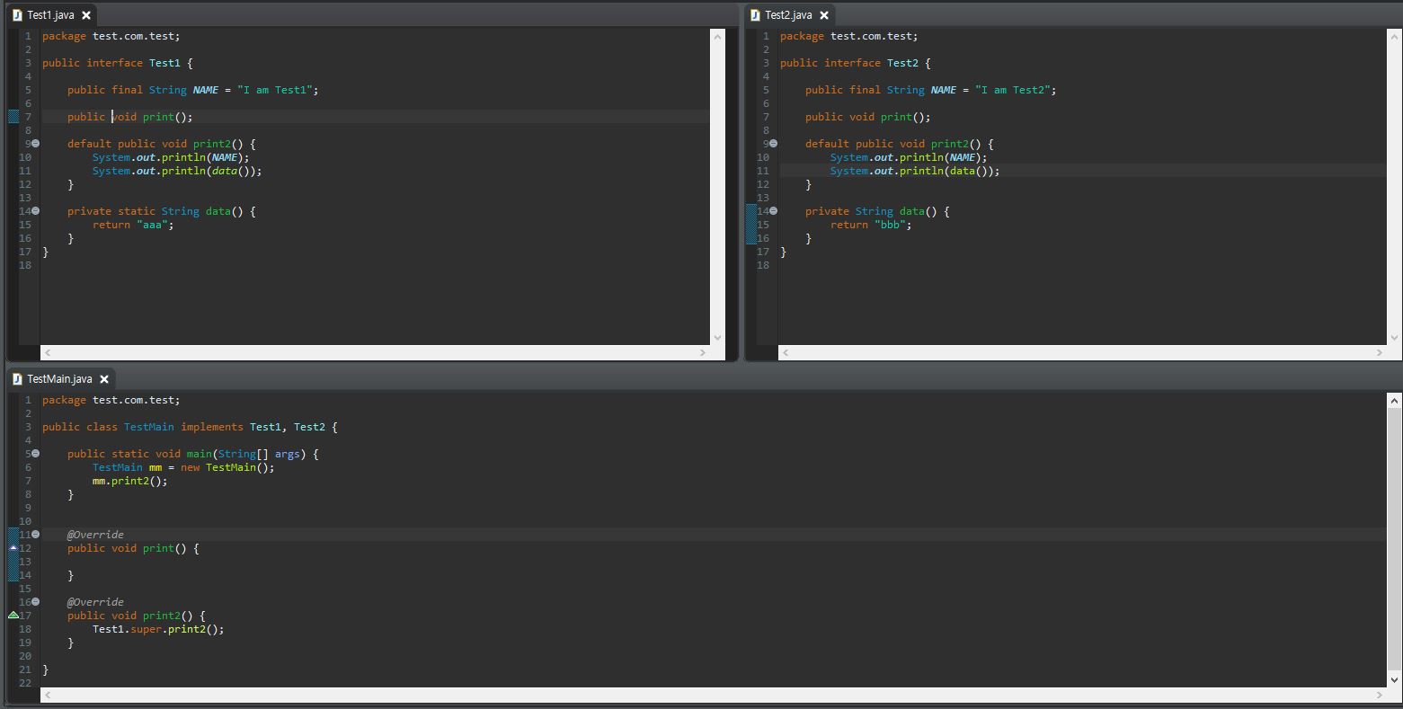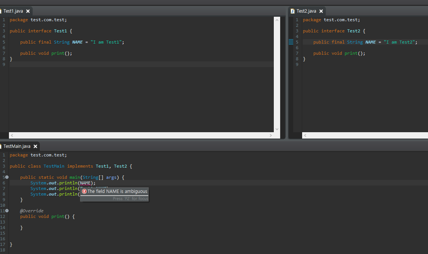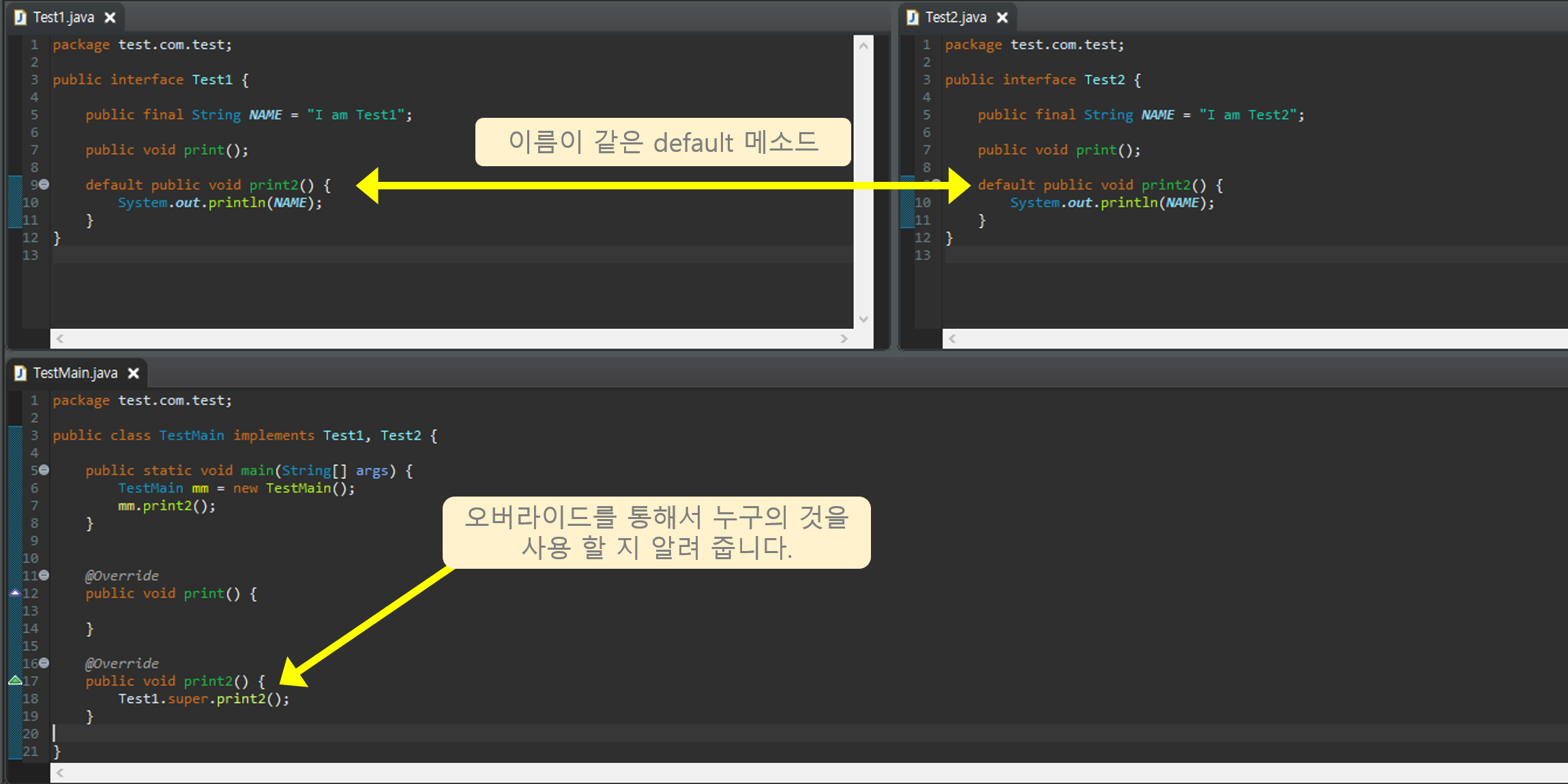 Test1과 Test2의 인터페이스에서 메소드 이름이 print로 동일 하지만 상속 받는 TestMain 클래스 입장에서는 몸통이 없는(내용이 없는) 메소드 이므로 따로 구분없이 Override 1개만으로도 상속이 가능 합니다.