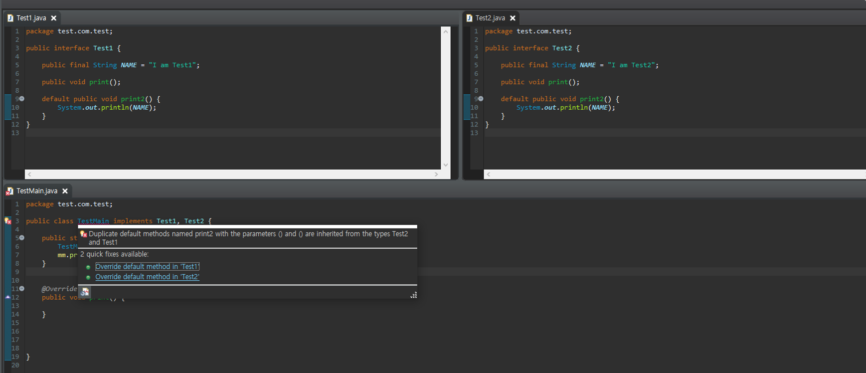 만약 Test1과 Test2 인터페이스가 default 메소드 이름이 같으면 역시나 모호한 상태라고 오류가 발생합니다.
