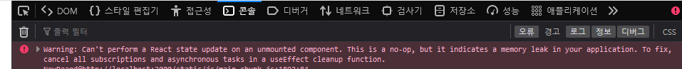 이러한 경고(오류)가 나오는 원인은 페이지 이동 이벤트(routing)가 일어나면서, 기존의 useEffect 내부의 내용이 이미 지나버린 페이지에 대해서 동작하였기 때문입니다.