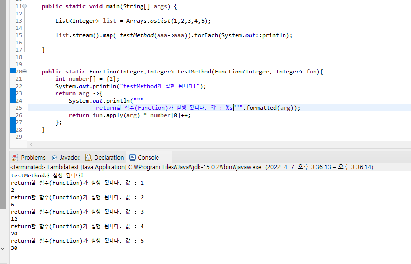 testMethod에서 리턴한 함수식만 리스트의 크기에 맞게 map 메소드에 의해서 사용되는 것을 볼 수 있습니다.