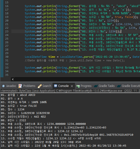 System.out.println(String.format("08. 8진수 : %o", 1234));