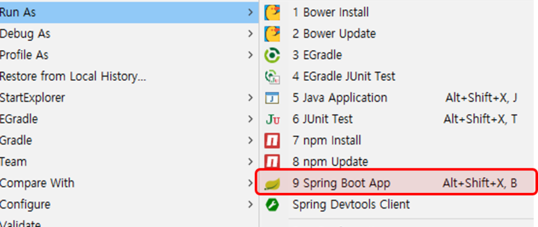 실행하는 방법은 프로젝트를 선택한 다음에 우클릭하고 Spring Boot App을 누르면 된다.